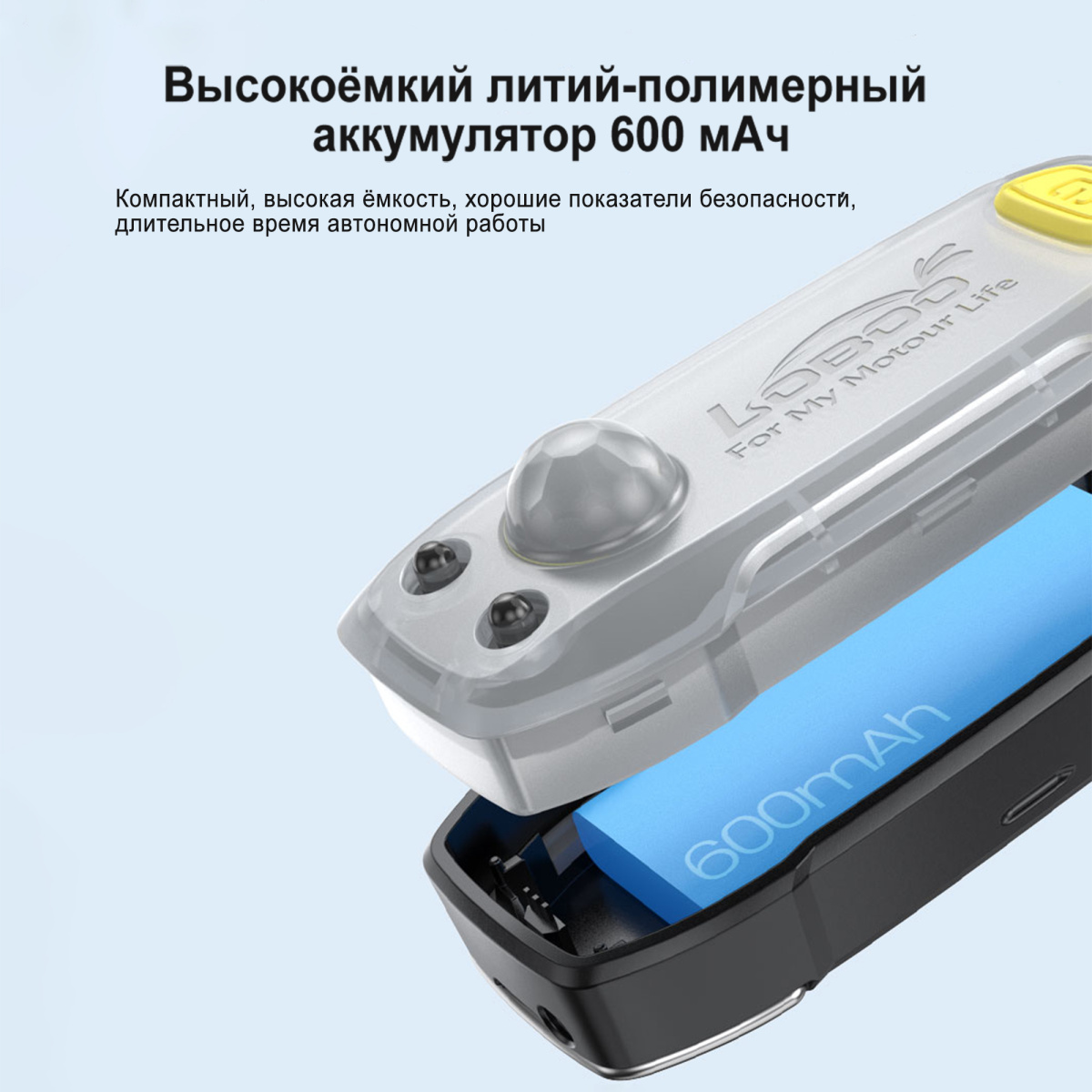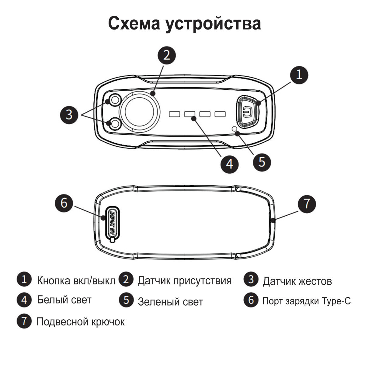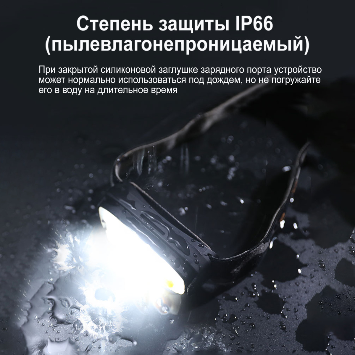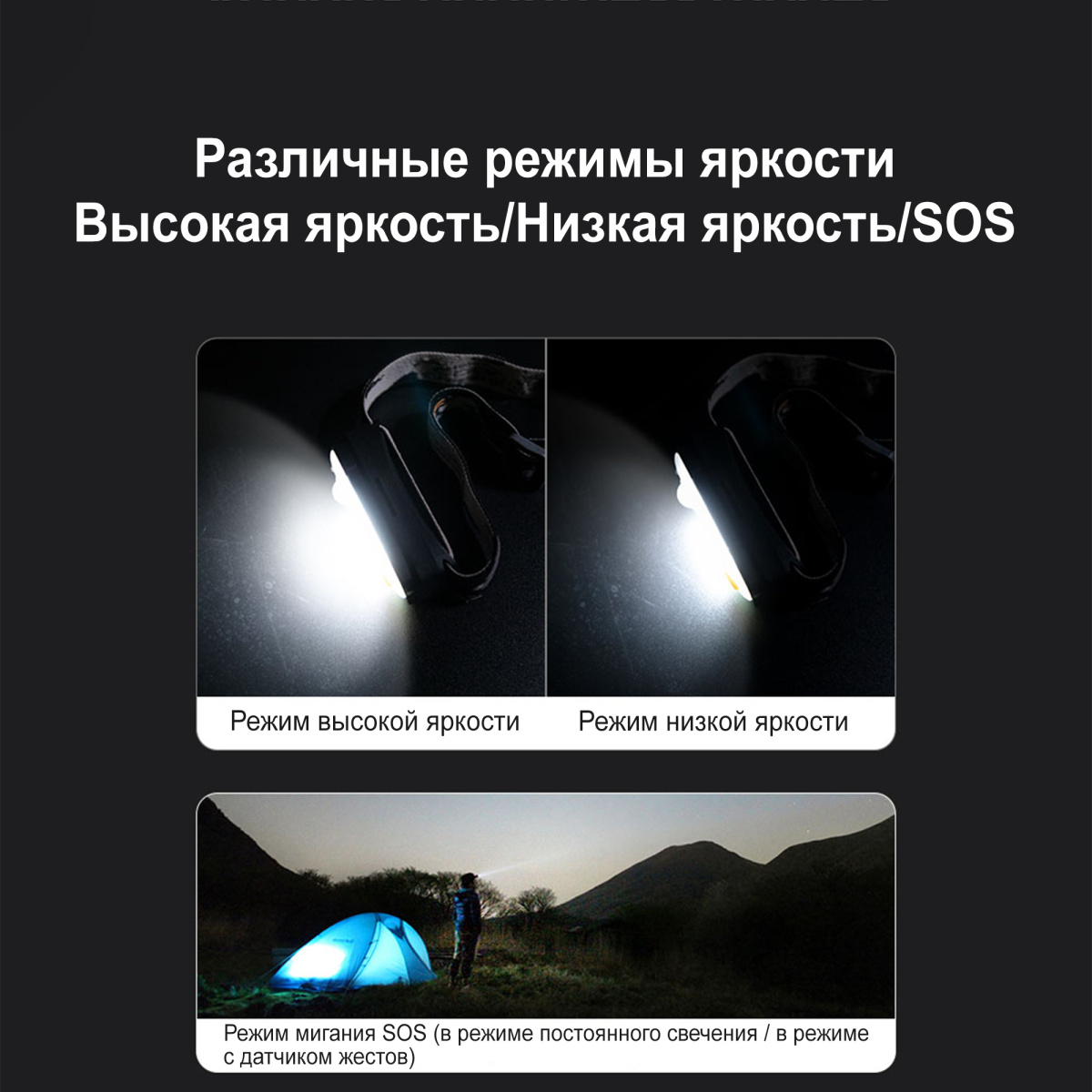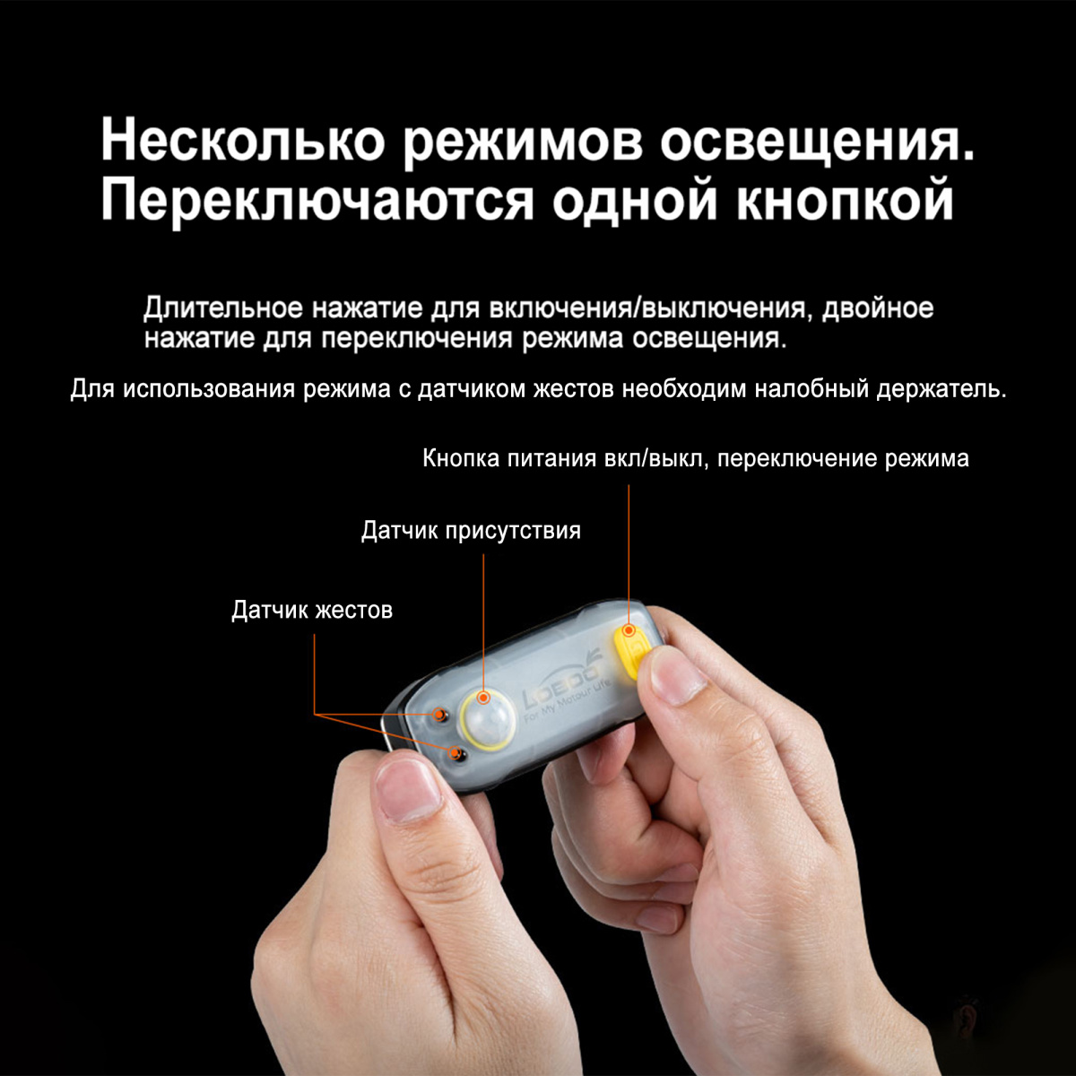 - Умный режим с датчиком жестов - автоматическое включение/выключение при движении руки (работает с налобным держателем).