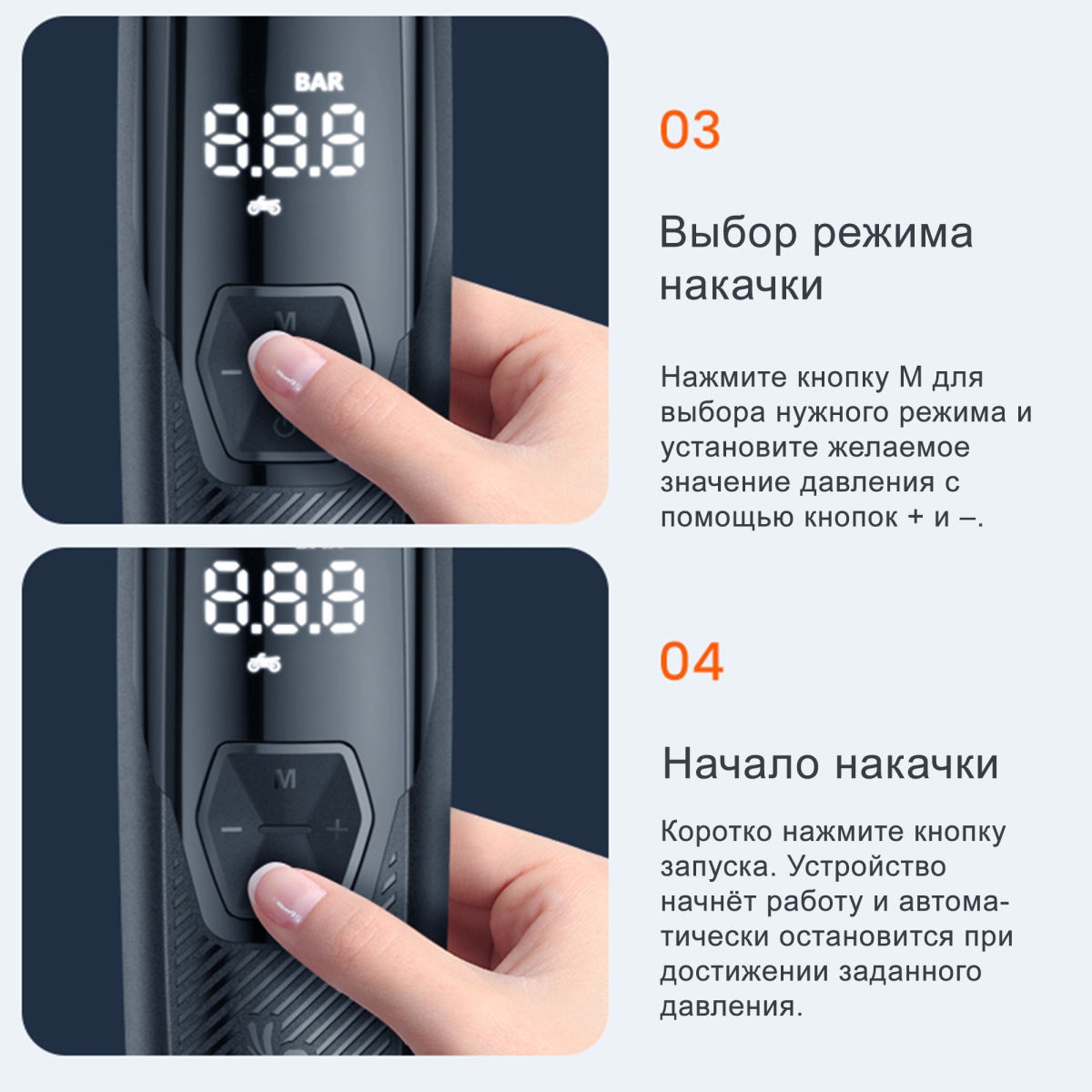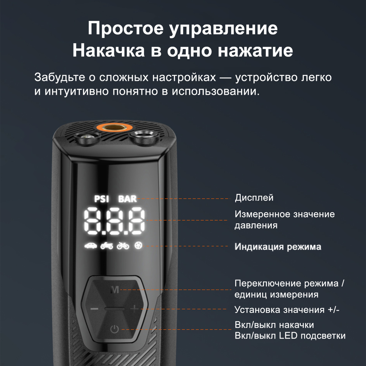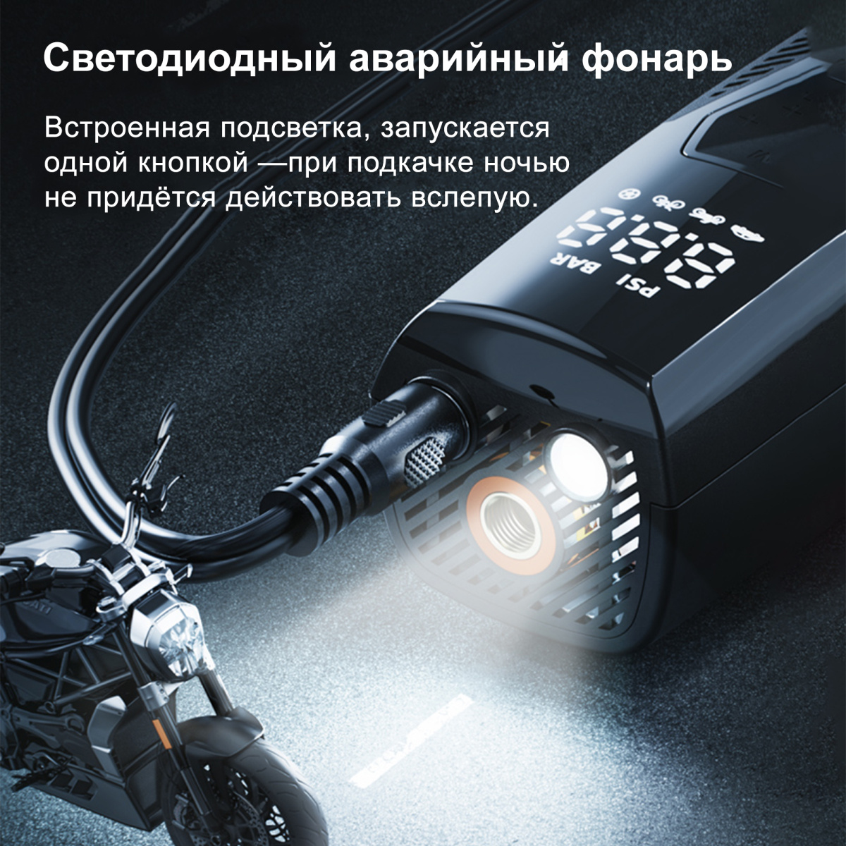 - Точный контроль:Встроенный манометр с точностью ±1 PSI и 5 предустановленными режимами (включая специальный для мотоцикла) гарантируют идеальное давление в шинах. Компрессор автоматически отключается при достижении заданного значения.