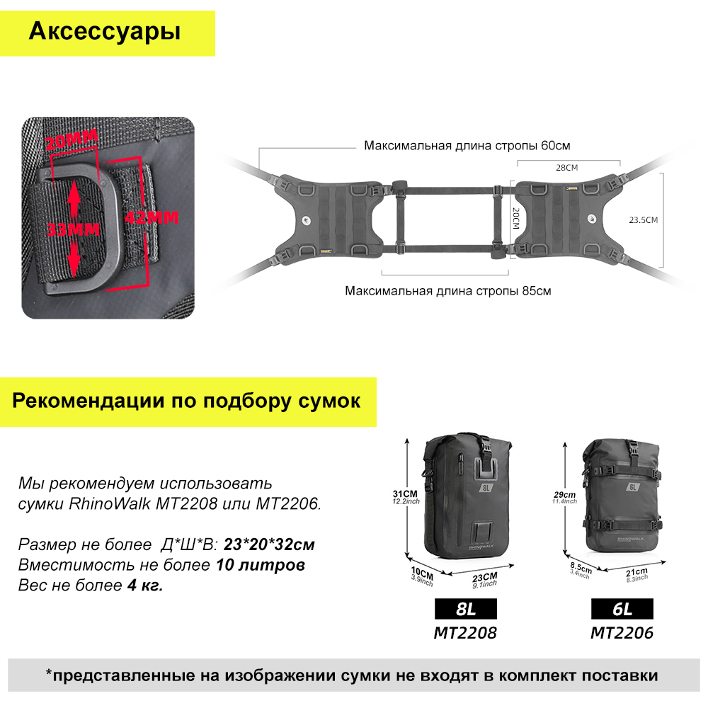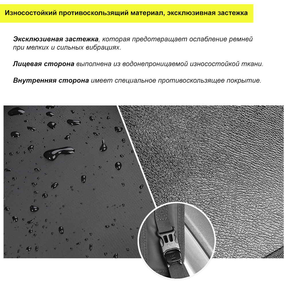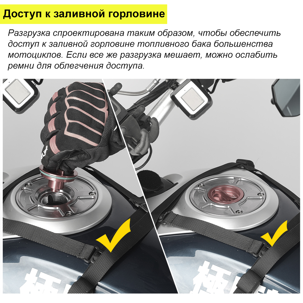 Вместимость кофров очень ограничена и часто в дальнюю дорогу надо взять еще что-то, а места уже нет. На помощь в данной ситуации прийдет разгрузка на топливный бак RhinoWalk MTR001B. Разгрузка проста по конструктиву и подойдет практически для любого мотоцикла. Внешняя сторона разгрузки имеет водонепроницаемый слой, внутренняя сторона имеет противоскользящее покрытие, чтобы минимизировать повреждение лакокрасочного покрытия во время эксплуатации. Разгрузка крепится на топливный бак четырьмя ремнями, которые оснащены фирменной фурнитурой Rhinowalk, которая препятствует ослаблению ремней. Разгрузка не перекрывает доступ к топливному баку. При помощи системы крепления MOLLE, к разгрузке можно прикрепить две сумки, правую и левую. Производитель рекомендует нагружать сумки симметрично, чтобы снизить нагрузку на точки крепления. Рекомендуется устанавливать мотосумки объемом не более 10 литров и нагружать не более 4 килограмм на одну сторону. Так же не рекомендуется использование разгрузки на постоянной основе, так как песок и дорожная пыль неизбежно попадут между баком и разгрузкой, что в свою очередь, приведет к повреждению лакокрасочного покрытия топливного бака.