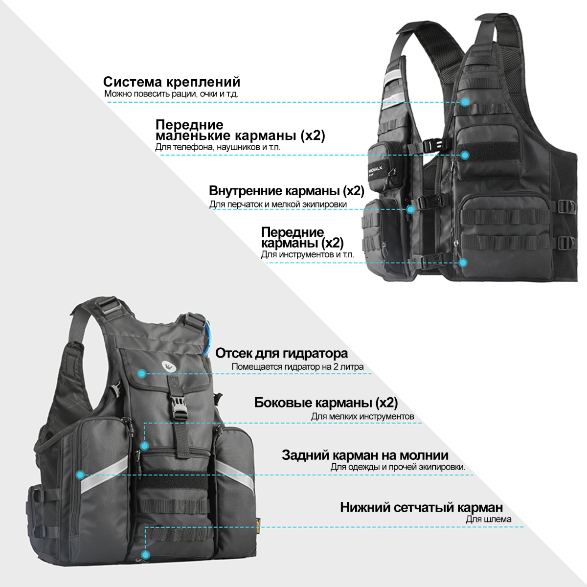 - Регулировка под любой рост плечевые лямки имеют улучшенную систему регулировки, позволяющую быстро подогнать длину. Дополнительные стяжки по бокам дают возможность адаптировать жилет под нужный объем, чтобы он не болтался и плотно сидел на теле.